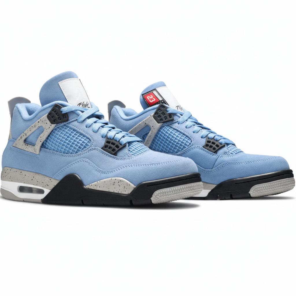 The Air Jordan 4 Retro “University Blue” delivers a perfect blend of classic Jordan heritage and fresh collegiate style. Dressed in a smooth University Blue suede upper, this iconic silhouette is accented with black, cement grey, and white details, creating a bold yet timeless look inspired by Michael Jordan’s alma mater.