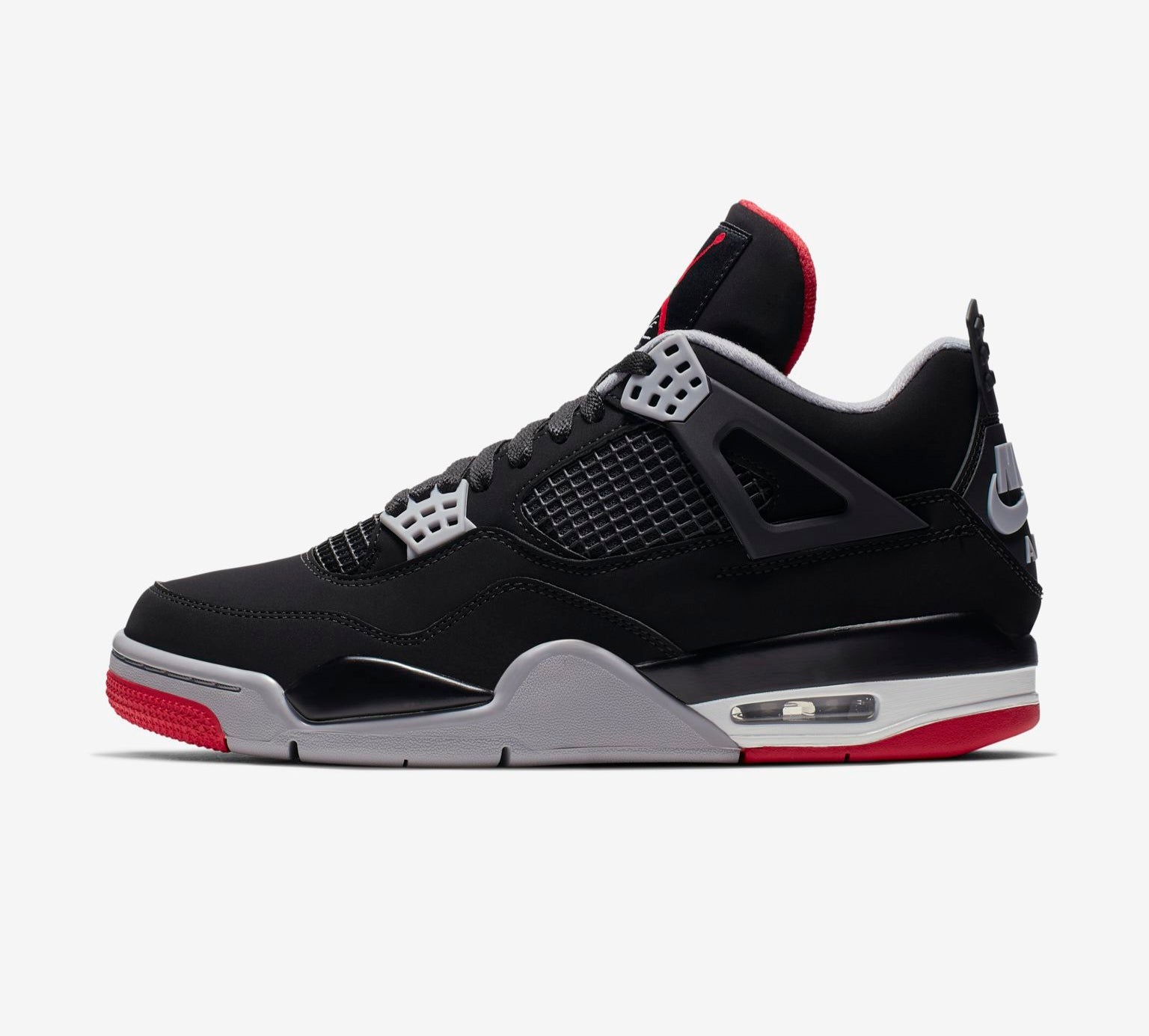The Air Jordan 4 “Bred” is one of the most iconic colorways in the Jordan family. “Bred” stands for Black + Red. The shoe features a primarily black upper with grey and cement accents, and red touches on the tongue and outsole. Over its lifetime, the 4 “Bred” has been retroed multiple times (1999, 2008, 2012, 2019) — and more recently in a “Reimagined” version that updates materials and construction while retaining the classic color blocking.