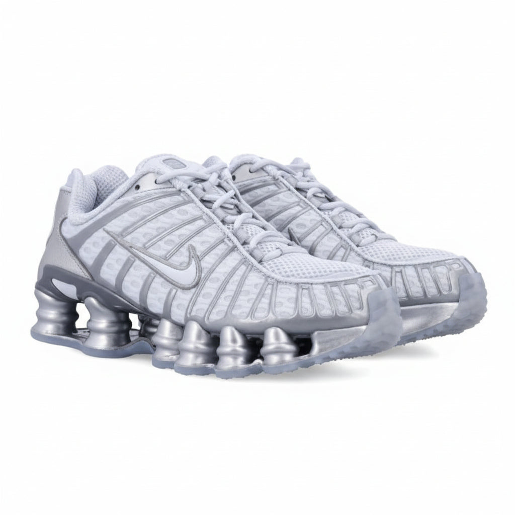 The Nike Shox TL in Pure Platinum/Chrome reinvents a classic Nike silhouette with a sleek, modern colorway and signature Shox cushioning. Known for its distinctive spring-like columns in the heel, the Shox TL delivers responsive impact protection with an energetic feel that’s perfect for lifestyle wear and dynamic movement. The Pure Platinum upper paired with reflective Chrome accents gives this sneaker a futuristic yet versatile look that pairs effortlessly with streetwear, casual outfits, and performance-inspired styles.